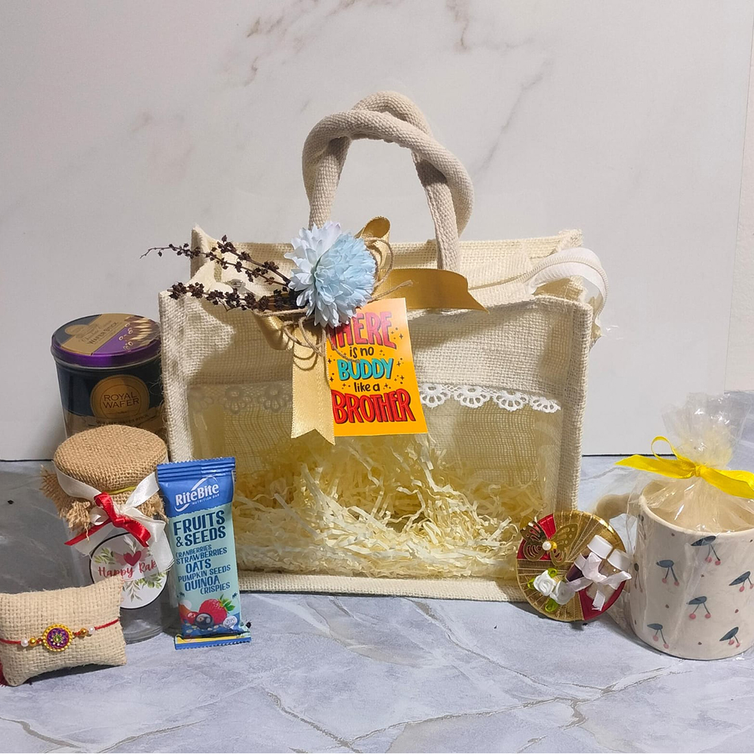 A heartfelt Rakhi Jute tote, adorned with a sweet “No Buddy Like a Brother” tag, brimming with thoughtful delights for a special bond.